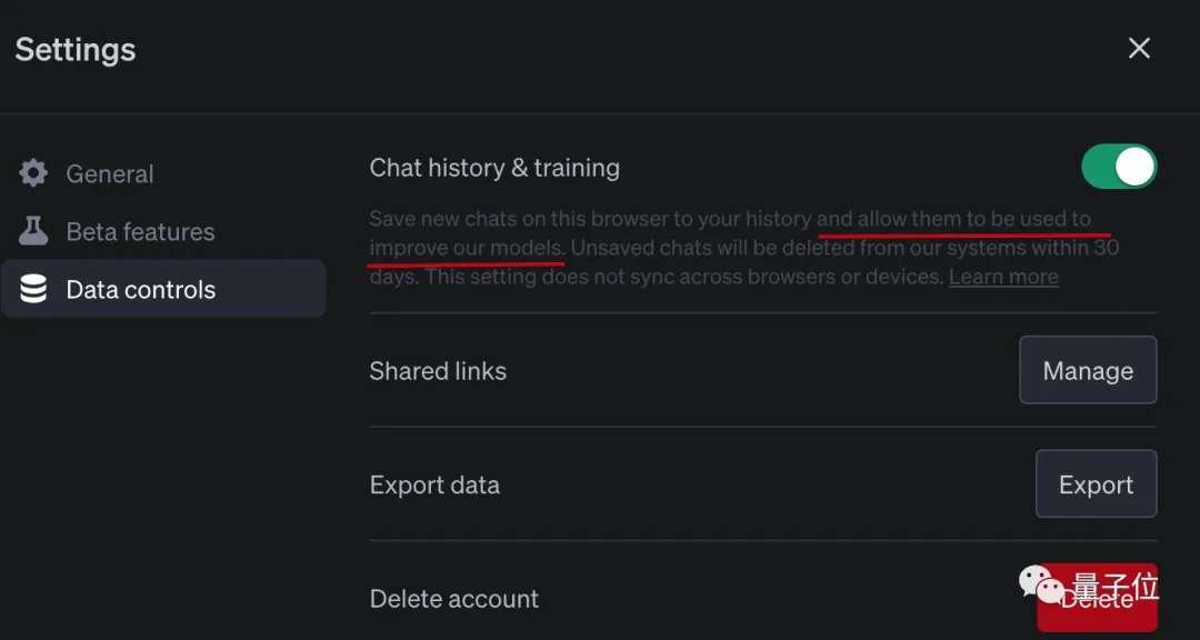 目前,ChatGPT客户端的对话数据默认会被用于训练,而且这个设置是与保存聊天对话功能是绑定的。