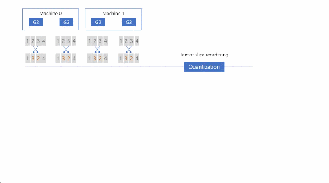 首先,在任何通信发生之前,我们对梯度进行切片并对张量切片重新排序,以保证通信结束时每个 GPU 上的最终梯度位置(即图 5 中的绿色块)是正确的。其次,我们量化重新排序的梯度切片,在每个节点内进行 all-to-all 通信,从 all-to-all 中对接收到的梯度切片进行反量化,并进行局部 reduce。第三,我们再次量化局部 reduce 后的梯度,进行节点间的 all-to-all 通信,再次对接收到的梯度进行反量化,并计算最终的高精度梯度 reduce,得到图 5 中绿色块的结果。