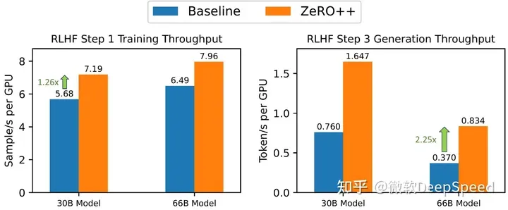 图 9: ZeRO++ 加速了 RLHF 训练的生成和训练阶段