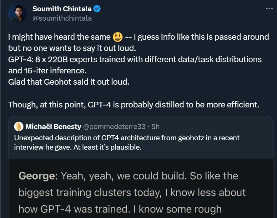 在这段播客播出之后,PyTorch 创建者 Soumith Chintala 表示自己似乎听过同样的「传闻」,很多人可能也听过,但只有 George Hotz 在公开场合将其说了出来。