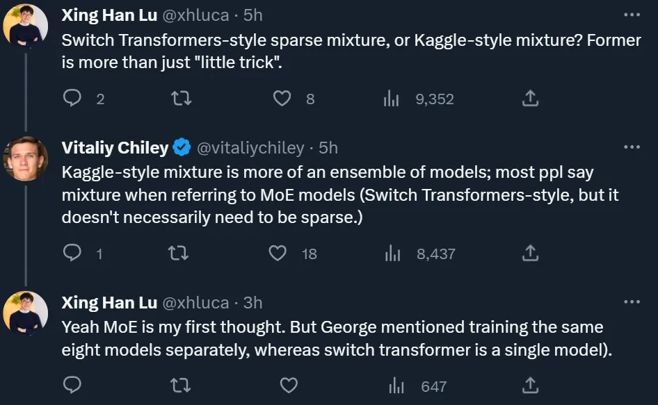 「混合模型是你在无计可施的时候才会考虑的选项,」George Hotz 调侃说,「混合模型的出现是因为无法让模型的参数规模超过 2200 亿。他们希望模型变得更好,但如果仅仅是训练时间更长,效果已经递减。因此,他们采用了八个专家模型来提高性能。」至于这个混合模型是以什么形式工作的,George Hotz 并没有详细说明。