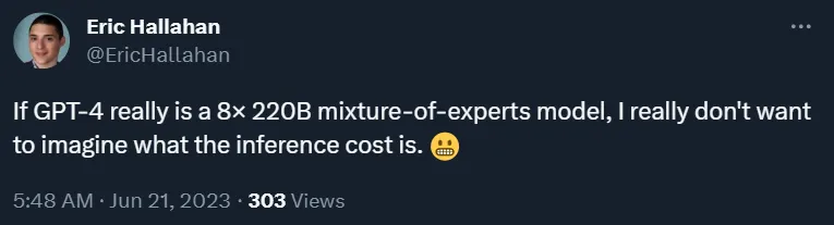 还有人说,如果真的像 George Hotz 说的那样,GPT-4 是一个由 8 个 2200 亿参数的专家模型组合的混合模型,那很难想象背后的推理成本有多高。