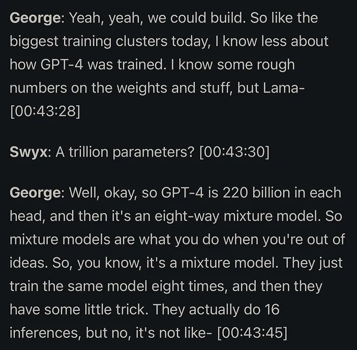 为什么 OpenAI 对此讳莫如深呢?George Hotz 认为,除了苹果之外,大部分公司保密的原因都不是在隐藏什么黑科技,而是在隐藏一些「不那么酷」的东西,不想让别人知道「只要花 8 倍的钱你也能得到这个模型」。