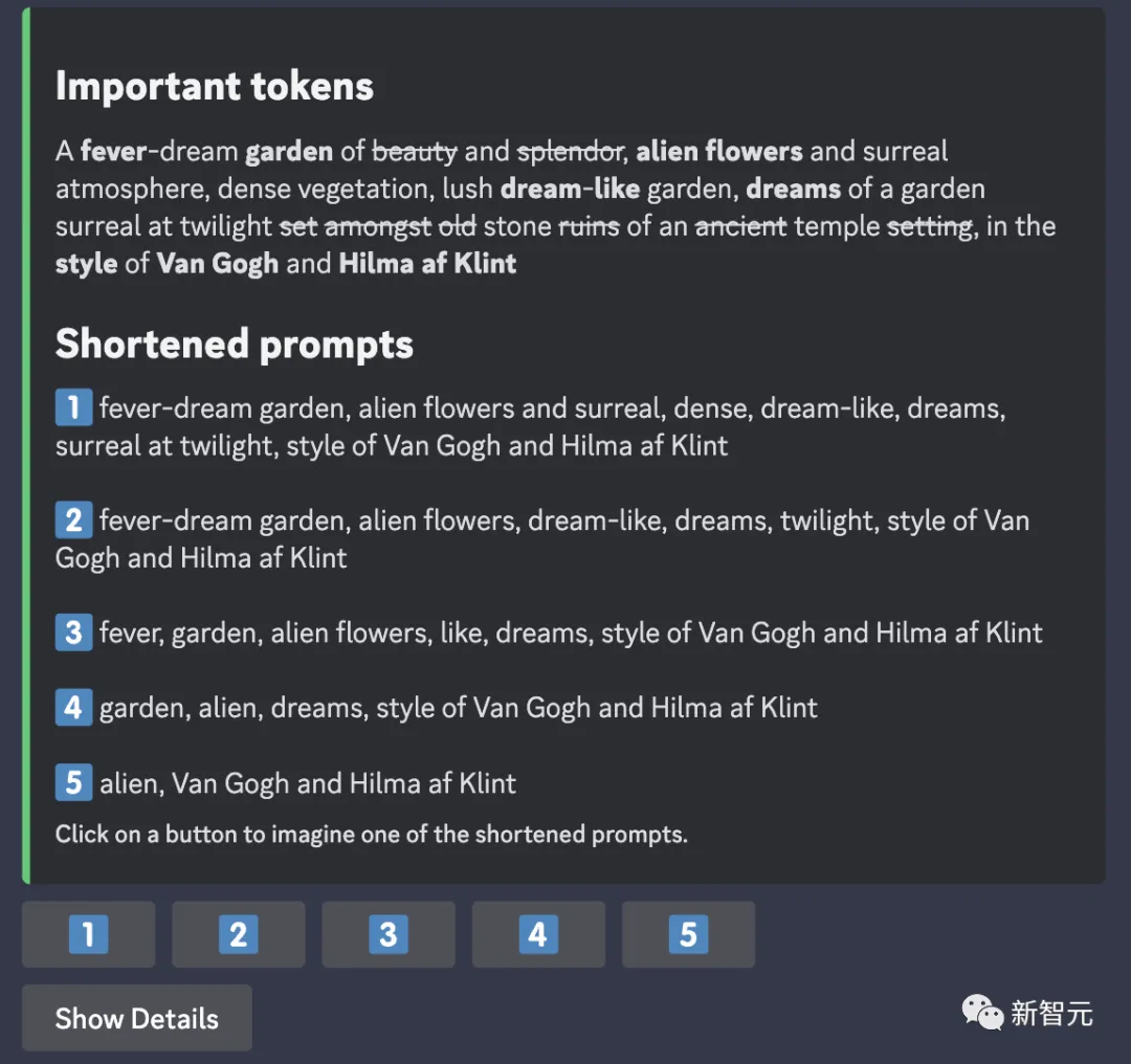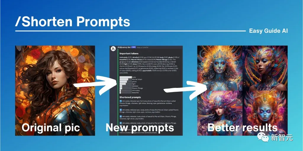 而这次Midjourney更新的缩短」命令功能,就可以分析prompt的成分,为我们提供了一些替代方案的建议。
