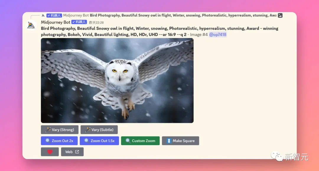 只要通过「/image」命令输入提示,Midjourney就会根据你的prompt生成四个视觉迭代图,你可以选择自己最喜欢的一个来放大,这个过程中,整个图像都会以更高的细节被渲染。