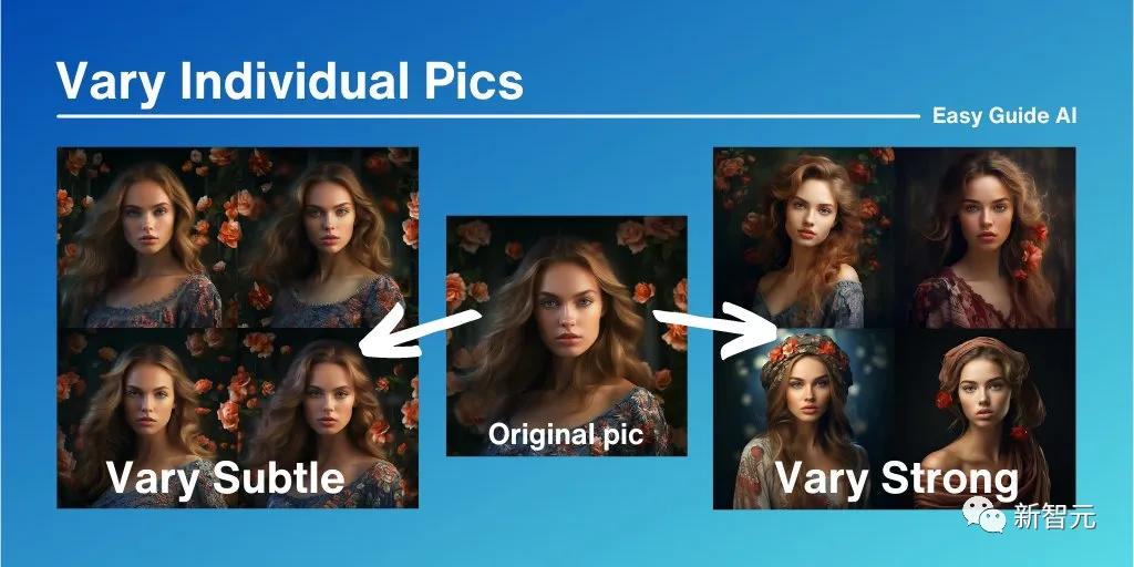 在prompt中使用「低变化」模式,就能生成一致的角色形象,而如果选择「高变化」,就会导致与原始输出的较大的视觉差别,四张图片就会更加具有创意和艺术表现力。