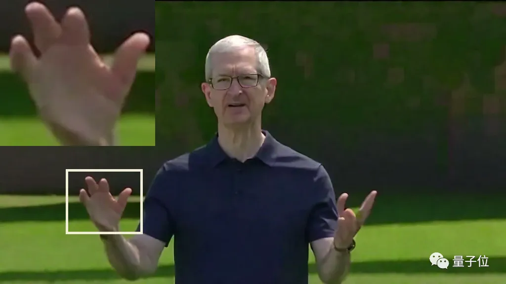 真实人物方面,AI绘画工具在手部处理上的通病似乎也没能避免——仿制的库克照片只有四根手指。