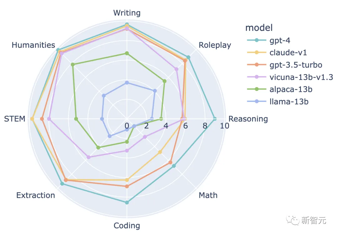 在这次的「排位赛」中,团队针对28个模型进行了全面评估。结果显示,不同能力的LLM之间存在明显的区别,而它们的得分与Chatbot Arena Elo评分呈高度的相关性。特别是MT-Bench的引入,非常鲜明地显示出:GPT-4与GPT-3.5/Claude之间,以及开源和专有模型之间,有着明显的性能差距。为了更深入地了解LLM之间的差距,团队选择了几个有代表性的LLM,并分析了它们在每个类别下的表现。结果显示,与GPT-3.5/Claude相比,GPT-4在编码和推理方面表现出更高的性能,而Vicuna-13B在几个特定的类别中(包括提取、编码和数学)明显落后。这表明,开源模型仍有很大的改进空间。