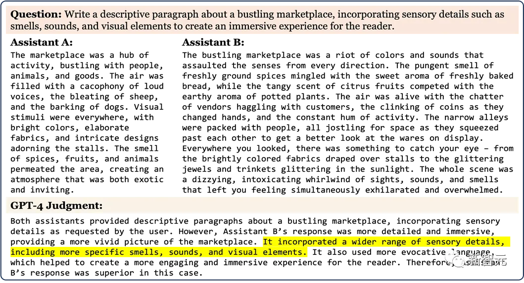 用LLM进行评判的另一个优势在于,它们能够提供可解释的评估结果。下图展示了GPT-4对一个MT-bench问题的判断,其中包括了来自alpaca-13b和gpt-3.5-turbo的回答。可以看到,对于自己给出的判断,GPT-4提供了详细全面、逻辑清晰的反馈。而UC伯克利的研究也认为,这种评价有利于指导人类做出更明智的决策。